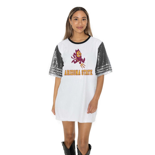 ARIZONA STATE SUN DEVILS BLING IT FULL SEQUIN FASHION JERSEY TUNIC DRESS WITH SPORTS STRIPE SLEEVE DETAIL AND LIGHTWEIGHT GARMENT LINING
