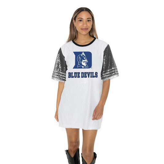 DUKE BLUE DEVILS BLING IT FULL SEQUIN FASHION JERSEY TUNIC DRESS WITH SPORTS STRIPE SLEEVE DETAIL AND LIGHTWEIGHT GARMENT LINING