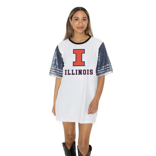 ILLINOIS FIGHTING ILLINI BLING IT FULL SEQUIN FASHION JERSEY TUNIC DRESS WITH SPORTS STRIPE SLEEVE DETAIL AND LIGHTWEIGHT GARMENT LINING