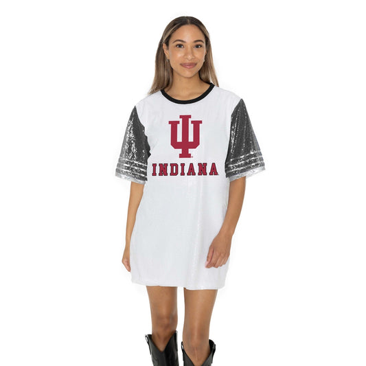 INDIANA HOOSIERS BLING IT FULL SEQUIN FASHION JERSEY TUNIC DRESS WITH SPORTS STRIPE SLEEVE DETAIL AND LIGHTWEIGHT GARMENT LINING