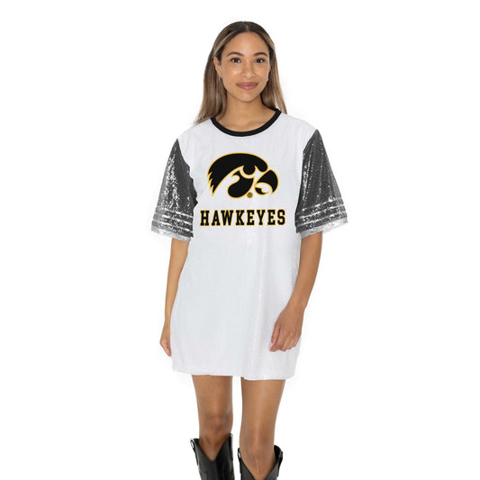 IOWA HAWKEYES BLING IT FULL SEQUIN FASHION JERSEY TUNIC DRESS WITH SPORTS STRIPE SLEEVE DETAIL AND LIGHTWEIGHT GARMENT LINING
