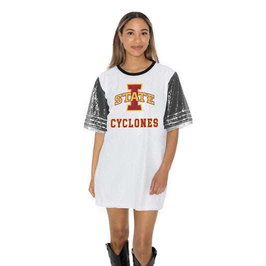 IOWA STATE CYCLONES BLING IT FULL SEQUIN FASHION JERSEY TUNIC DRESS WITH SPORTS STRIPE SLEEVE DETAIL AND LIGHTWEIGHT GARMENT LINING