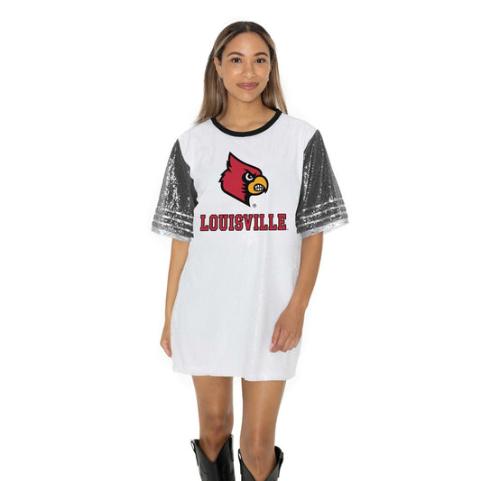 LOUISVILLE CARDINALS BLING IT FULL SEQUIN FASHION JERSEY TUNIC DRESS WITH SPORTS STRIPE SLEEVE DETAIL AND LIGHTWEIGHT GARMENT LINING