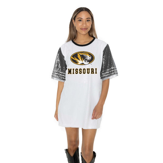 MISSOURI TIGERS BLING IT FULL SEQUIN FASHION JERSEY TUNIC DRESS WITH SPORTS STRIPE SLEEVE DETAIL AND LIGHTWEIGHT GARMENT LINING