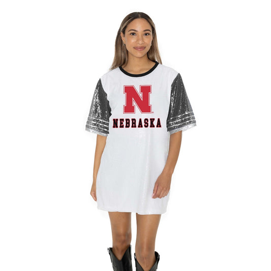 NEBRASKA CORNHUSKERS BLING IT FULL SEQUIN FASHION JERSEY TUNIC DRESS WITH SPORTS STRIPE SLEEVE DETAIL AND LIGHTWEIGHT GARMENT LINING