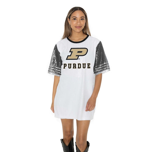 PURDUE BOILERMAKERS BLING IT FULL SEQUIN FASHION JERSEY TUNIC DRESS WITH SPORTS STRIPE SLEEVE DETAIL AND LIGHTWEIGHT GARMENT LINING