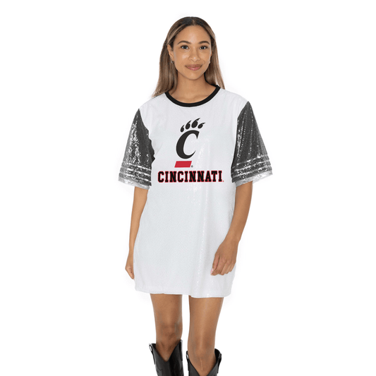 CINCINNATI BEARCATS BLING IT FULL SEQUIN FASHION JERSEY TUNIC DRESS WITH SPORTS STRIPE SLEEVE DETAIL AND LIGHTWEIGHT GARMENT LINING