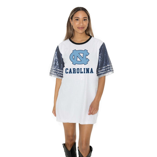 NORTH CAROLINA TAR HEELS BLING IT FULL SEQUIN FASHION JERSEY TUNIC DRESS WITH SPORTS STRIPE SLEEVE DETAIL AND LIGHTWEIGHT GARMENT LINING