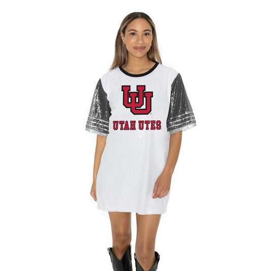 UTAH UTES BLING IT FULL SEQUIN FASHION JERSEY TUNIC DRESS WITH SPORTS STRIPE SLEEVE DETAIL AND LIGHTWEIGHT GARMENT LINING