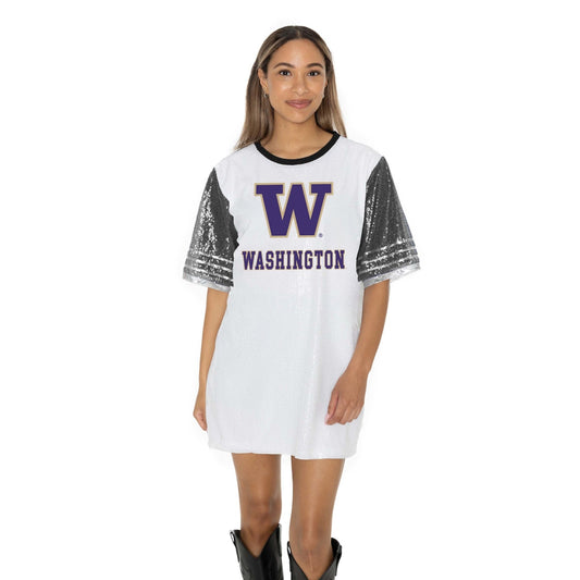 WASHINGTON HUSKIES BLING IT FULL SEQUIN FASHION JERSEY TUNIC DRESS WITH SPORTS STRIPE SLEEVE DETAIL AND LIGHTWEIGHT GARMENT LINING