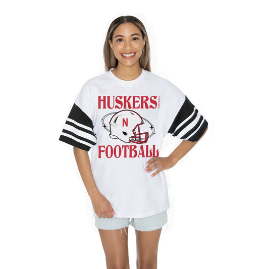 NEBRASKA CORNHUSKERS STARTING LINEUP BOLD CONTRAST, OVERSIZED, SPORTY HERITAGE-STRIPED TEE WITH JERSEY MESH SHORT SLEEVES AND RIBBED NECKLINE