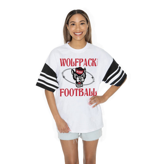 NORTH CAROLINA STATE WOLFPACK STARTING LINEUP BOLD CONTRAST, OVERSIZED, SPORTY HERITAGE-STRIPED TEE WITH JERSEY MESH SHORT SLEEVES AND RIBBED NECKLINE