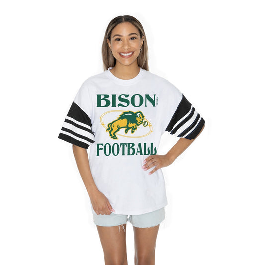 NORTH DAKOTA STATE BISON STARTING LINEUP BOLD CONTRAST, OVERSIZED, SPORTY HERITAGE-STRIPED TEE WITH JERSEY MESH SHORT SLEEVES AND RIBBED NECKLINE