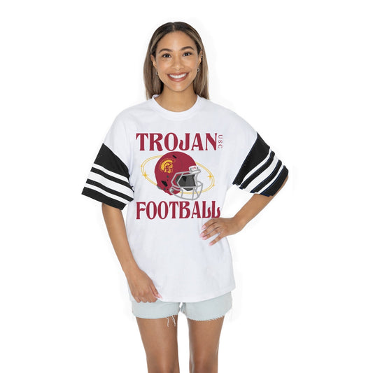 USC TROJANS STARTING LINEUP BOLD CONTRAST, OVERSIZED, SPORTY HERITAGE-STRIPED TEE WITH JERSEY MESH SHORT SLEEVES AND RIBBED NECKLINE