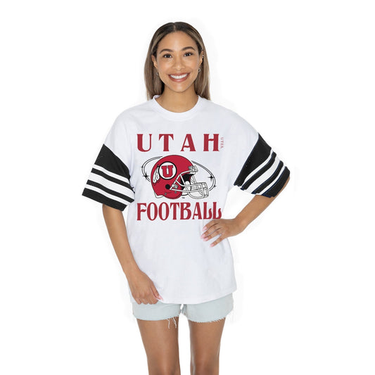 UTAH UTES STARTING LINEUP BOLD CONTRAST, OVERSIZED, SPORTY HERITAGE-STRIPED TEE WITH JERSEY MESH SHORT SLEEVES AND RIBBED NECKLINE