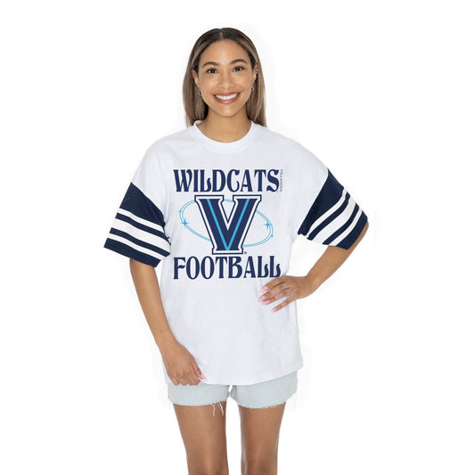 VILLANOVA WILDCATS STARTING LINEUP BOLD CONTRAST, OVERSIZED, SPORTY HERITAGE-STRIPED TEE WITH JERSEY MESH SHORT SLEEVES AND RIBBED NECKLINE