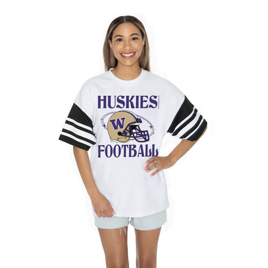 WASHINGTON HUSKIES STARTING LINEUP BOLD CONTRAST, OVERSIZED, SPORTY HERITAGE-STRIPED TEE WITH JERSEY MESH SHORT SLEEVES AND RIBBED NECKLINE