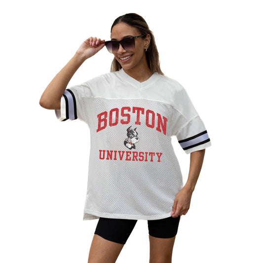 BOSTON UNIVERSITY TERRIERS A STEP AHEAD ICONIC OVERSIZED MESH SHORT SLEEVE V-NECK FASHION JERSEY TOP WITH SIDE SLITS