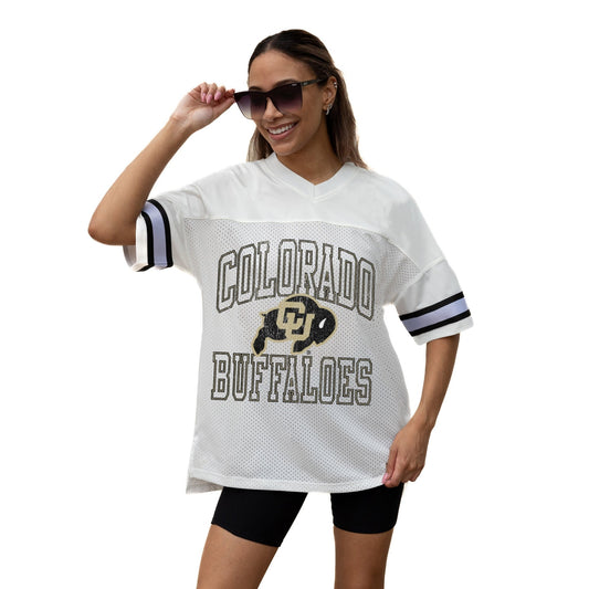 COLORADO BUFFALOES A STEP AHEAD ICONIC OVERSIZED MESH SHORT SLEEVE V-NECK FASHION JERSEY TOP WITH SIDE SLITS
