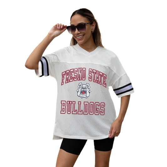 FRESNO STATE BULLDOGS A STEP AHEAD ICONIC OVERSIZED MESH SHORT SLEEVE V-NECK FASHION JERSEY TOP WITH SIDE SLITS
