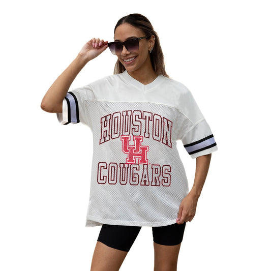 HOUSTON COUGARS A STEP AHEAD ICONIC OVERSIZED MESH SHORT SLEEVE V-NECK FASHION JERSEY TOP WITH SIDE SLITS
