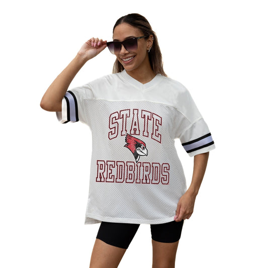 ILLINOIS STATE REDBIRDS A STEP AHEAD ICONIC OVERSIZED MESH SHORT SLEEVE V-NECK FASHION JERSEY TOP WITH SIDE SLITS