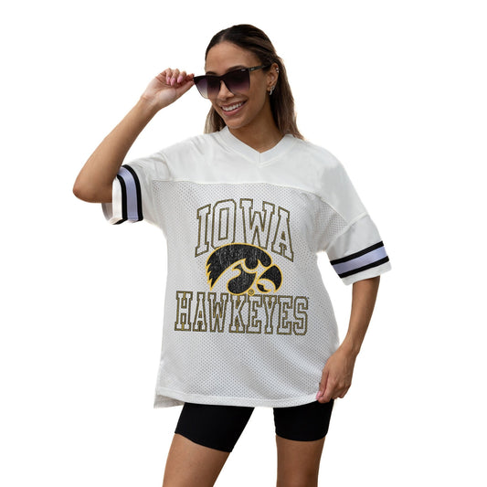 IOWA HAWKEYES A STEP AHEAD ICONIC OVERSIZED MESH SHORT SLEEVE V-NECK FASHION JERSEY TOP WITH SIDE SLITS