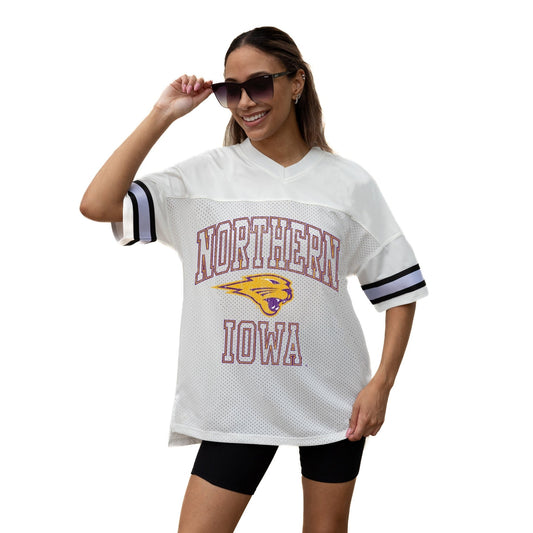 NORTHERN IOWA PANTHERS A STEP AHEAD ICONIC OVERSIZED MESH SHORT SLEEVE V-NECK FASHION JERSEY TOP WITH SIDE SLITS