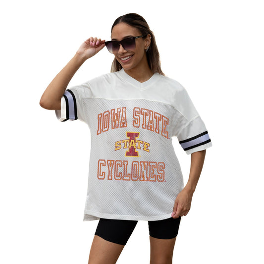 IOWA STATE CYCLONES A STEP AHEAD ICONIC OVERSIZED MESH SHORT SLEEVE V-NECK FASHION JERSEY TOP WITH SIDE SLITS