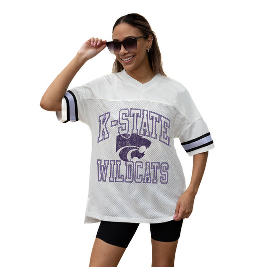KANSAS STATE WILDCATS A STEP AHEAD ICONIC OVERSIZED MESH SHORT SLEEVE V-NECK FASHION JERSEY TOP WITH SIDE SLITS