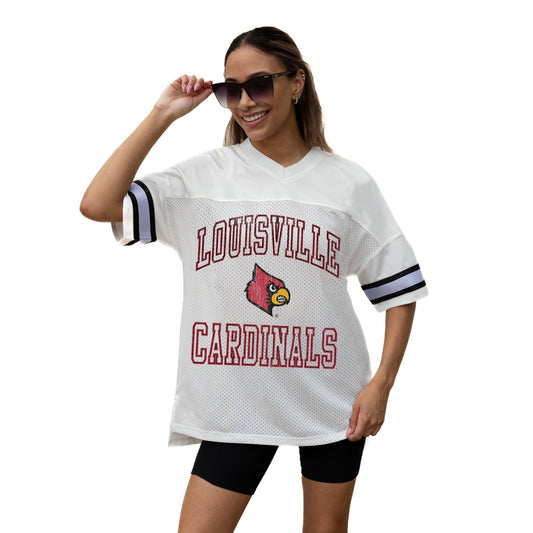 LOUISVILLE CARDINALS A STEP AHEAD ICONIC OVERSIZED MESH SHORT SLEEVE V-NECK FASHION JERSEY TOP WITH SIDE SLITS