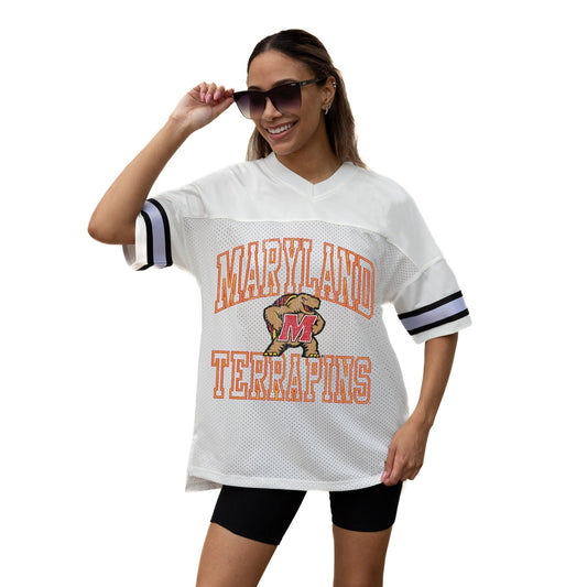 MARYLAND TERRAPINS A STEP AHEAD ICONIC OVERSIZED MESH SHORT SLEEVE V-NECK FASHION JERSEY TOP WITH SIDE SLITS