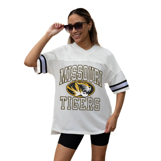 MISSOURI TIGERS A STEP AHEAD ICONIC OVERSIZED MESH SHORT SLEEVE V-NECK FASHION JERSEY TOP WITH SIDE SLITS