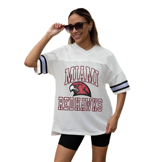 MIAMI OF OHIO REDHAWKS A STEP AHEAD ICONIC OVERSIZED MESH SHORT SLEEVE V-NECK FASHION JERSEY TOP WITH SIDE SLITS