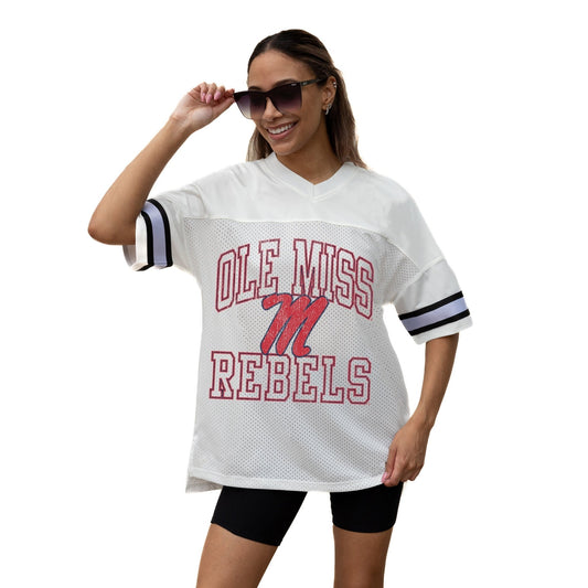 OLE MISS REBELS A STEP AHEAD ICONIC OVERSIZED MESH SHORT SLEEVE V-NECK FASHION JERSEY TOP WITH SIDE SLITS