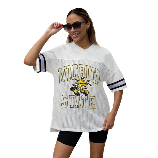WICHITA STATE SHOCKERS A STEP AHEAD ICONIC OVERSIZED MESH SHORT SLEEVE V-NECK FASHION JERSEY TOP WITH SIDE SLITS