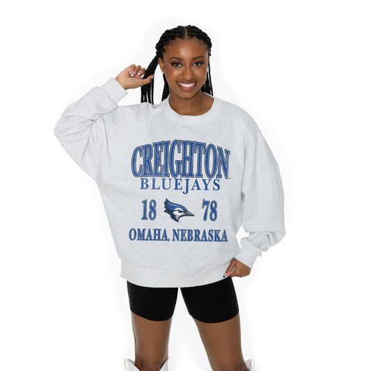 CREIGHTON BLUEJAYS ALLEGIANCE LONG SLEEVE UNISEX FIT PREMIUM FLEECE CREWNECK SWEATSHIRT WITH RIBBED KNIT NECKLINE, WRIST, AND WAISTBAND