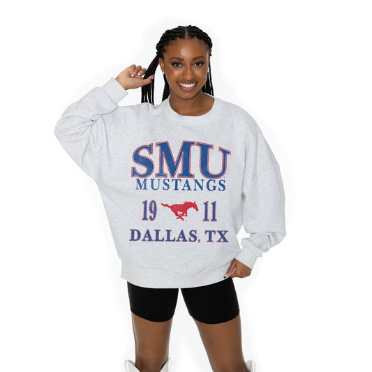 SMU MUSTANGS ALLEGIANCE LONG SLEEVE UNISEX FIT PREMIUM FLEECE CREWNECK SWEATSHIRT WITH RIBBED KNIT NECKLINE, WRIST, AND WAISTBAND
