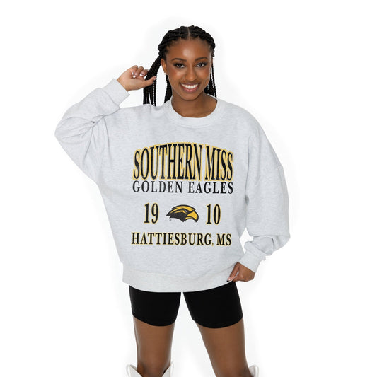 SOUTHERN MISS GOLDEN EAGLES ALLEGIANCE LONG SLEEVE UNISEX FIT PREMIUM FLEECE CREWNECK SWEATSHIRT WITH RIBBED KNIT NECKLINE, WRIST, AND WAISTBAND