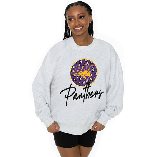 NORTHERN IOWA PANTHERS GOING WILD LONG SLEEVE UNISEX FIT PREMIUM FLEECE CREWNECK SWEATSHIRT WITH RIBBED KNIT NECKLINE, WRIST, AND WAISTBAND