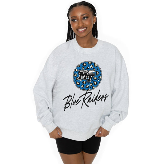 MIDDLE TENNESSEE STATE BLUE RAIDERS GOING WILD LONG SLEEVE UNISEX FIT PREMIUM FLEECE CREWNECK SWEATSHIRT WITH RIBBED KNIT NECKLINE, WRIST, AND WAISTBAND