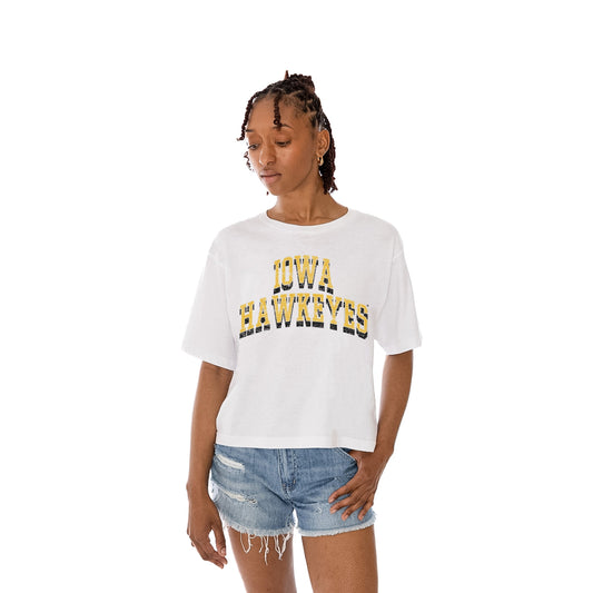 IOWA HAWKEYES CLAIM TO FAME WOMEN'S MIDI-LENGTH, BOXY FIT CROPPED TEE WITH DROP SHOULDER SLEEVE