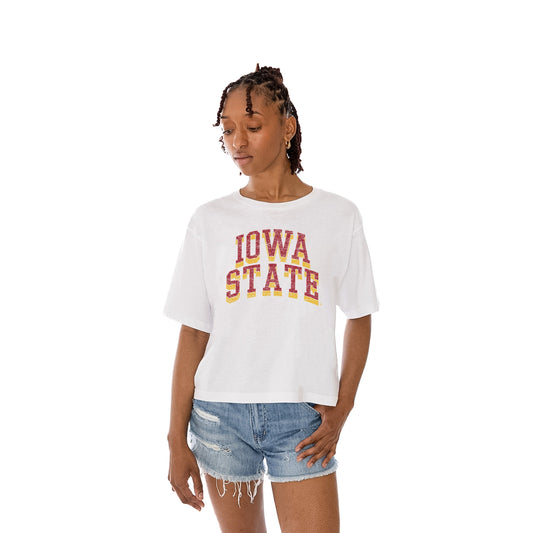IOWA STATE CYCLONES CLAIM TO FAME WOMEN'S MIDI-LENGTH, BOXY FIT CROPPED TEE WITH DROP SHOULDER SLEEVE