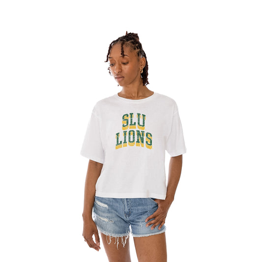 SOUTHEASTERN LOUISIANA LIONS CLAIM TO FAME WOMEN'S MIDI-LENGTH, BOXY FIT CROPPED TEE WITH DROP SHOULDER SLEEVE