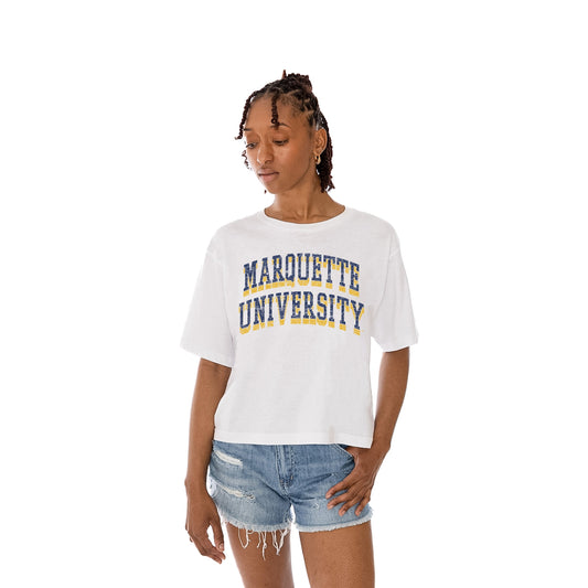 MARQUETTE GOLDEN EAGLES CLAIM TO FAME WOMEN'S MIDI-LENGTH, BOXY FIT CROPPED TEE WITH DROP SHOULDER SLEEVE