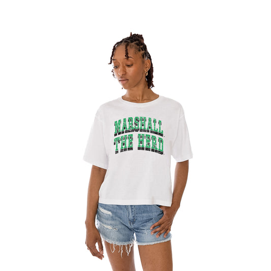 MARSHALL THUNDERING HERD CLAIM TO FAME WOMEN'S MIDI-LENGTH, BOXY FIT CROPPED TEE WITH DROP SHOULDER SLEEVE