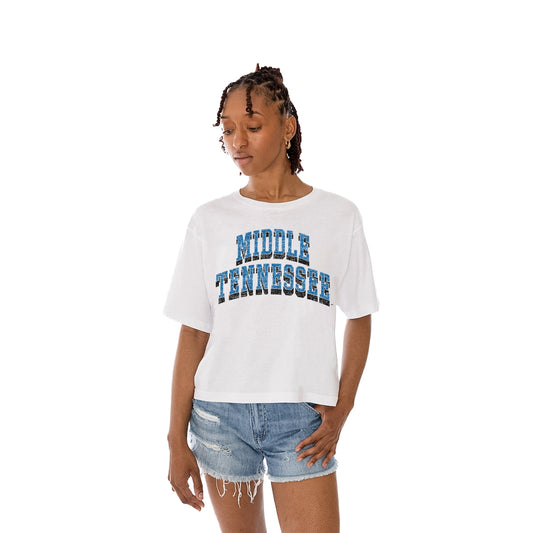 MIDDLE TENNESSEE STATE BLUE RAIDERS CLAIM TO FAME WOMEN'S MIDI-LENGTH, BOXY FIT CROPPED TEE WITH DROP SHOULDER SLEEVE