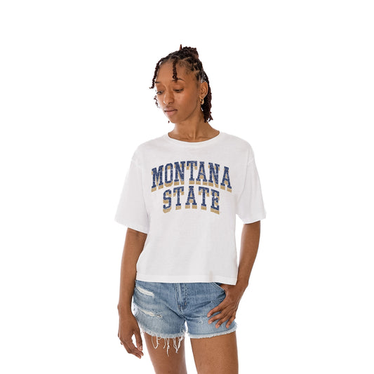 MONTANA STATE BOBCATS CLAIM TO FAME WOMEN'S MIDI-LENGTH, BOXY FIT CROPPED TEE WITH DROP SHOULDER SLEEVE
