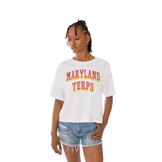 MARYLAND TERRAPINS CLAIM TO FAME WOMEN'S MIDI-LENGTH, BOXY FIT CROPPED TEE WITH DROP SHOULDER SLEEVE