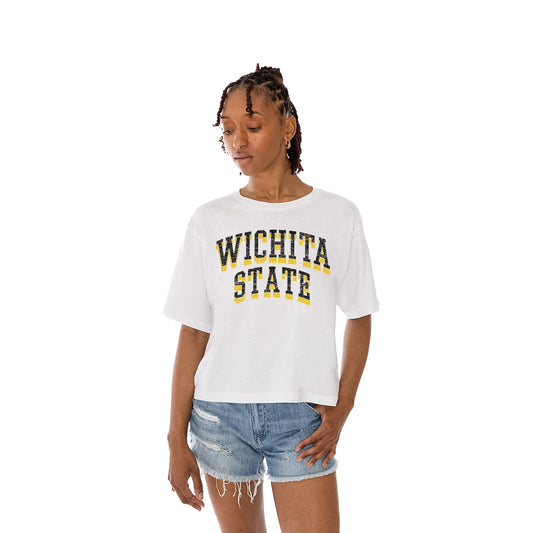 WICHITA STATE SHOCKERS CLAIM TO FAME WOMEN'S MIDI-LENGTH, BOXY FIT CROPPED TEE WITH DROP SHOULDER SLEEVE
